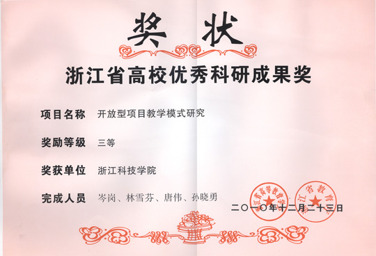由岑岗教授、林雪芬讲师、唐伟工程师、孙晓勇讲师合作研究的“开放型项目教学模式研究”研究成果获2010年浙江省高校优秀科研成果奖三等奖。